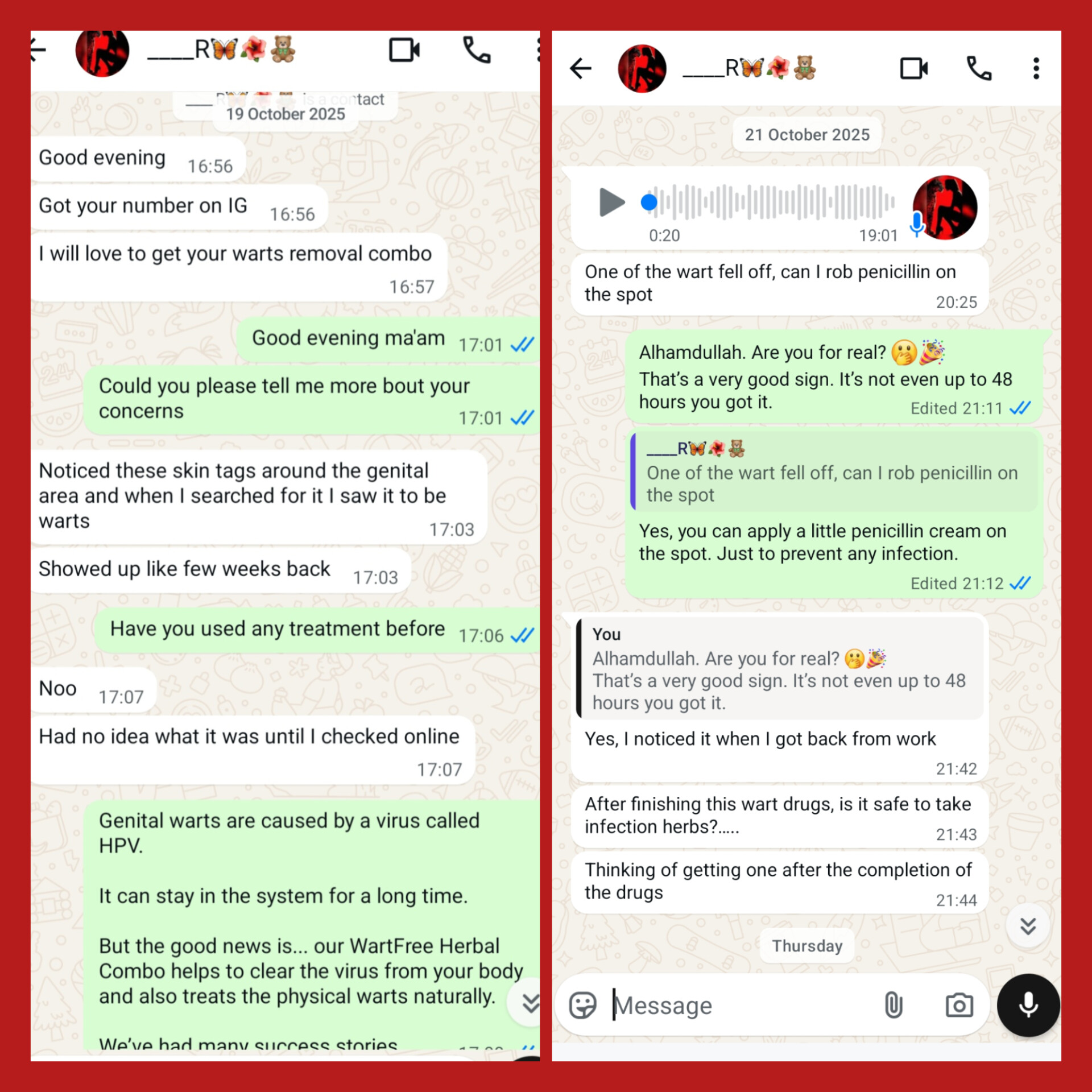 If you’re struggling like I once did, know that it's not a Life SENTENSE and there’s hope and healing naturally. Stop risking your life because of shame or negligence. In high-risk cases, Genital warts can lead to cervical or other cancer if Left Untreated. Act fast. Treat it naturally with WartFree Herbal Combo.